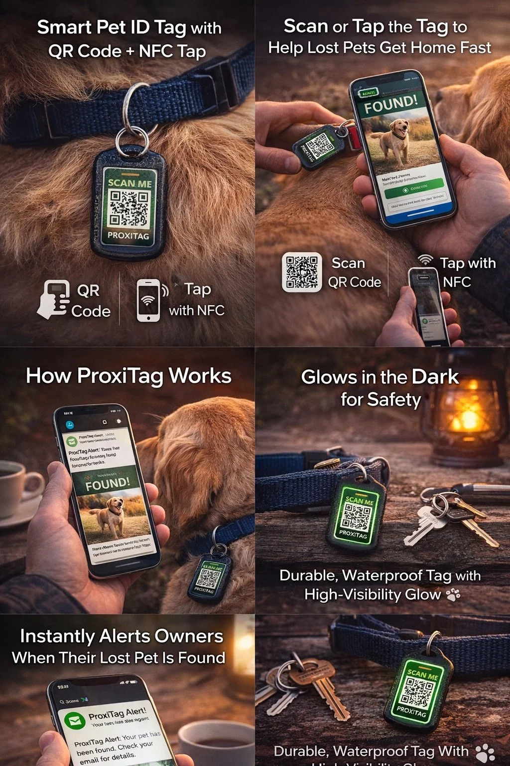 ProxiTag™ is a premium smart pet ID tag designed to reunite lost pets faster using QR scan + optional NFC tap technology.